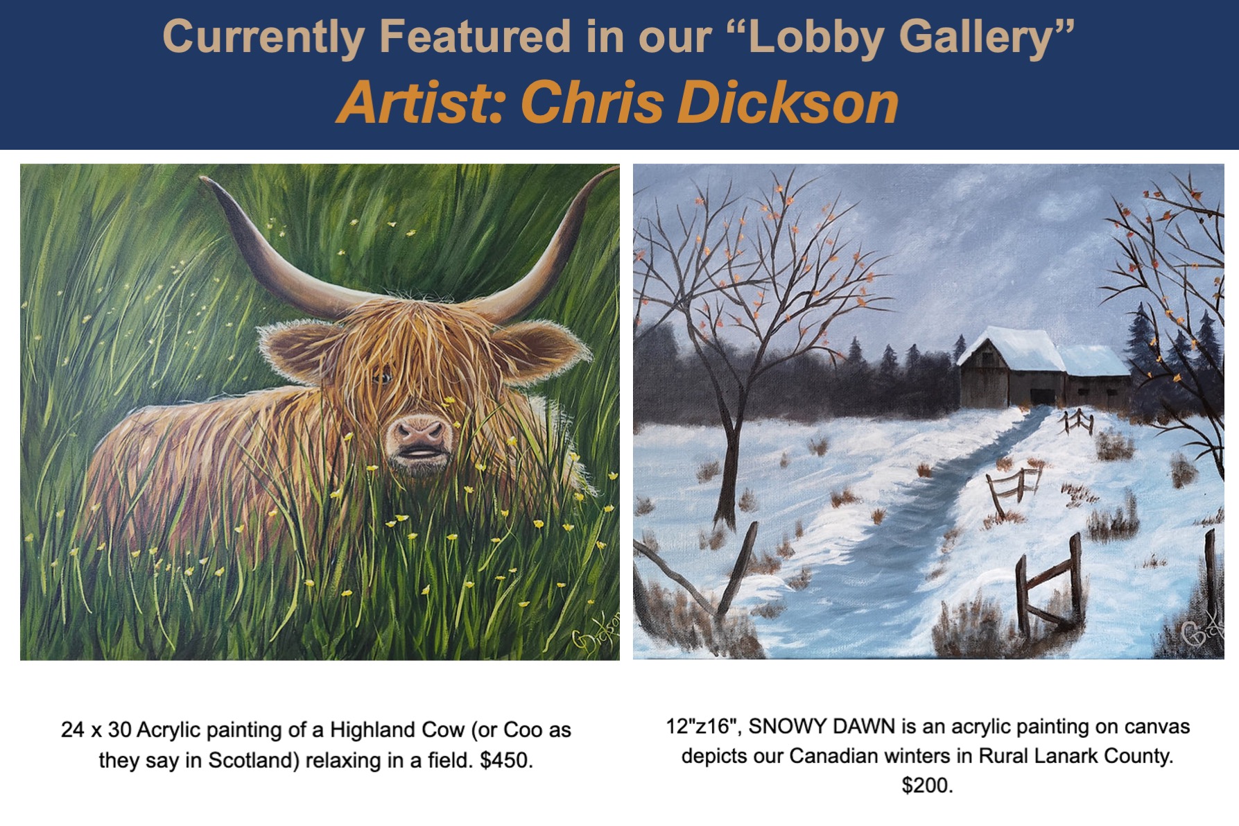 On exhibit in our lobby gallery, you will find a revolving display of works by local artists from in and around our community.