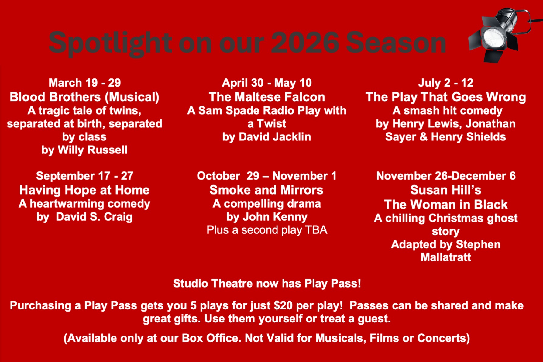 * Please note the Studio Theatre website is the only accurate and reliable source of date and ticket information regarding our shows.